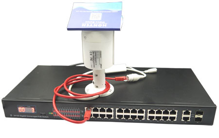 | 恒研电子的监控属于一个小型的监控工程,办公室,车间及仓库总共有27个监控点。系统的核心交换机为恒研新品功率可视24路POE交换机HY-1228GD-POE,成品仓及包装材料仓各有一个监控点用HY-E4-POE进行了接入扩展,如下图: | |||||||||
