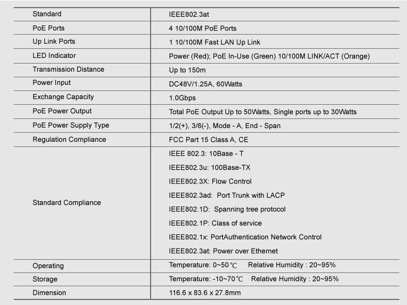 | HY-1105-POE是厦门恒研电子针对小型IP监控网络开发的的非网管PoE以太网交换机产品,提供5个10/100M自适应的RJ45端口,每端口均支持MDI/MDIX自动翻转功能,并可实现线速转发。1-4端口具有PoE功能,支持IEEE802.3at标准,可作为以太网供电设备,能自动检测识别符合IEEE 802.3af/at标准的受电设备,并通过网线为其供电。 HY-1105-POE使用简单方便,无需配置,即插即用,可灵活扩展家庭、办公室网络而不受电力线布局限制。 端口性能提供5个10/100M自适应RJ45端口,1~4端口具有PoE功能 每端口均支持MDI/MDIX自动翻转及自协商; 支持IEEE 802.3x全双工流控和Backpressure半双工流控; PoE性能支持IEEE802.3at标准 自动检测与识别符合IEEE 802.3af/at标准的PD设备并为其供电 单端口供电可达30W,总功率可达57W 使用简单即插即用,无需配置与安装,简单方便 |