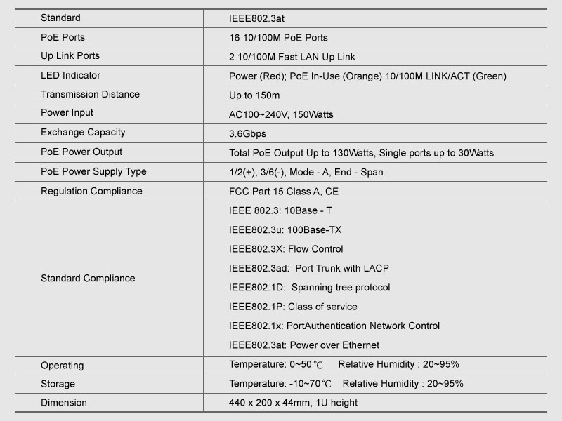| HY-1118-POE是厦门恒研电子针对小型IP监控网络开发的的非网管PoE以太网交换机产品,提供18个10/100M自适应的RJ45端口,每端口均支持MDI/MDIX自动翻转功能,并可实现线速转发。1-16端口具有PoE功能,支持IEEE802.3at标准,可作为以太网供电设备,能自动检测识别符合IEEE 802.3af/at标准的受电设备,并通过网线为其供电。 HY-1118-POE使用简单方便,无需配置,即插即用,可灵活扩展家庭、办公室网络而不受电力线布局限制。 端口性能提供18个10/100M自适应RJ45端口,1~16端口具有PoE功能 每端口均支持MDI/MDIX自动翻转及自协商; 支持IEEE 802.3x全双工流控和Backpressure半双工流控; PoE性能支持IEEE802.3at标准 自动检测与识别符合IEEE 802.3af/at标准的PD设备并为其供电 单端口供电可达30W,总功率可达130W 使用简单即插即用,无需配置与安装,简单方便 |