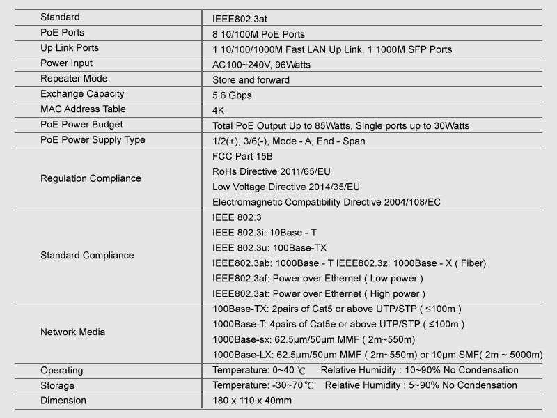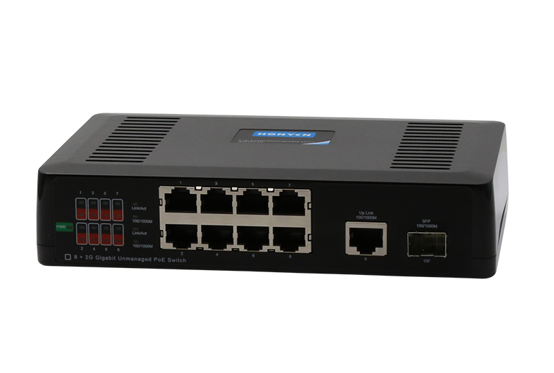| HY- 1410G-POE是厦门恒研电子专为满足4K IP监控网络的PoE供电需求而自主研发设计的千兆上联非网管PoE交换机,具有8个百兆RJ45端口、1个千兆RJ45端口及1个复用的SFP光纤模 块扩展插槽。其中8个百兆RJ45端口全部支持PoE供电,整机配备高品质DC52V/1.85A电源适配器, 最大供电功率达80W。非网管型交换机安装简单,即插即用,适合酒店、校园、厂区宿舍及中 小型企业组建经济高效的网络。 优异的PoE供电性能PoE特性符合IEEE 802.3at及IEEE 802.3af标准,自动检测与识别符合IEEE 802.3at及IEEE 802.3af标准的设备并为其供电;个百兆RJ45端口均具备PoE供电能力,每端口最大供电功率达30W;整机最大供电功率达80W; 灵活的扩展能力提供1个10/100/1000M RJ45,满足向千兆网络的无缝过渡,同时提供1个千兆SFP(mini GBIC)光纤模块扩展插槽,搭配使用SFP光纤模块即可方便连接至光纤骨干网络,大大扩展设备适用范围,节省用户投资。 |