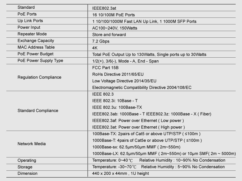 | HY- 1418G-POE是厦门恒研电子专为满足4K IP监控网络的PoE供电需求而自主研发设计的千兆上联非网管PoE交换机,具有16个百兆RJ45端口、1个千兆RJ45端口及1个复用的SFP光纤模 块扩展插槽。其中16个百兆RJ45端口全部支持PoE供电,最大供电功率达130W。非网管型交换机安装简单,即插即用,适合酒店、校园、厂区宿舍及中 小型企业组建经济高效的网络。 优异的PoE供电性能PoE特性符合IEEE 802.3at及IEEE 802.3af标准,自动检测与识别符合IEEE 802.3at及IEEE 802.3af标准的设备并为其供电; 16个百兆RJ45端口均具备PoE供电能力,每端口最大供电功率达30W;整机最大供电功率达130W; 灵活的扩展能力提供1个10/100/1000M RJ45,满足向千兆网络的无缝过渡,同时提供1个千兆SFP(mini GBIC)光纤模块扩展插槽,搭配使用SFP光纤模块即可方便连接至光纤骨干网络,大大扩展设备适用范围,节省用户投资。 |