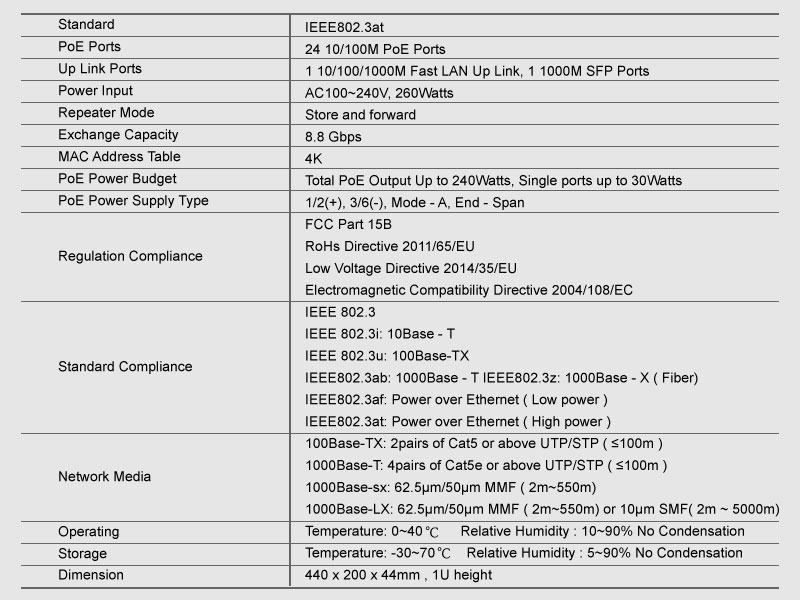 产品简介: HY-1426GD-POE是厦门市恒研电子科技公司于2015年推出的一款针对中低端工程预算的千兆交换机产品。 产品采用具超高性价比的台湾九阳IC+芯片组,在保证产品性能的同时极大的降低了产品成本。同时这款千兆交换机产品采用了恒研电子自主研发的功率可视技术,这项技术利用单片机实时监控交换机各口的功率输出情况,工程技术人员可以很方便的掌握系统的资源分配,适时对设备进行调整或者在POE供电能力有富余的情况下利用恒研1拖4POE延长器对交换机的接入能力进行扩充,充分利用现有投资。 产品接口: 这款产品有24个10/100M POE接口,和个千兆RJ45上行口及一个SFP光口,能充分满足4K条件下的大数据量视频信号传输。 |